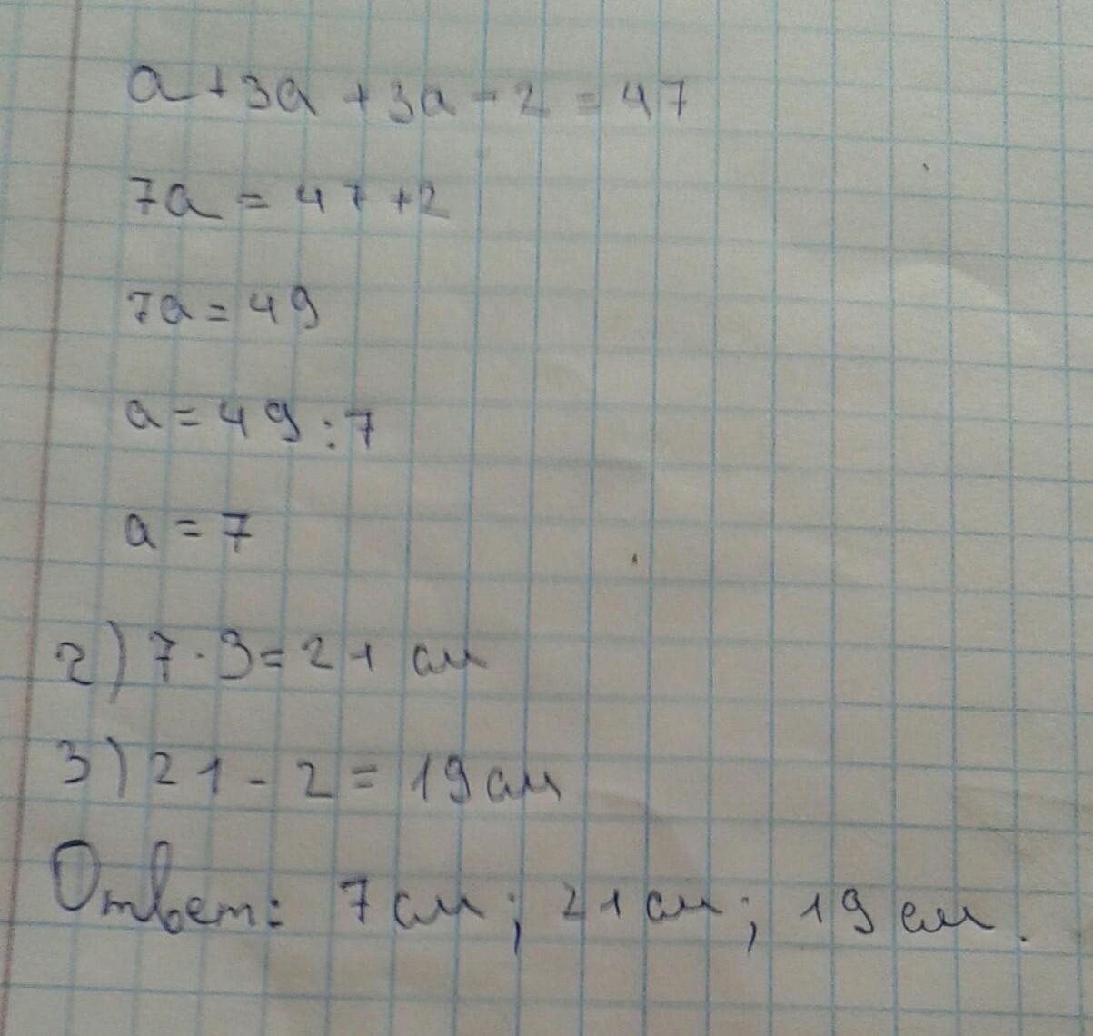 Одна из сторон треугольника равна a, вторая в 3 раза больше первой, а третья на 2 см меньше второй. Периметр треугольника равен 47 см. Найдите стороны треугольника.