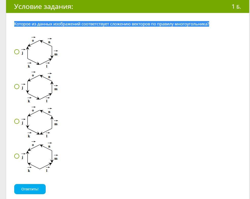 Которое из данных изображений соответствует сложению векторов по правилу многоугольника?