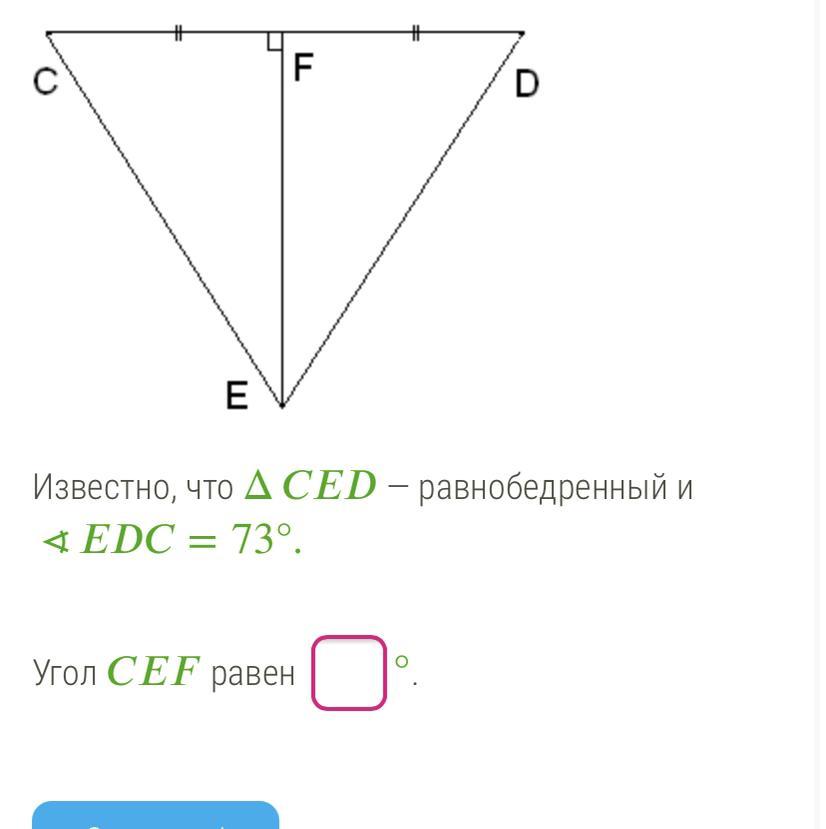 Т. К. Треугольник ФЦД - прямоугольный, то неизвестный угол = 90 - 73 = 17