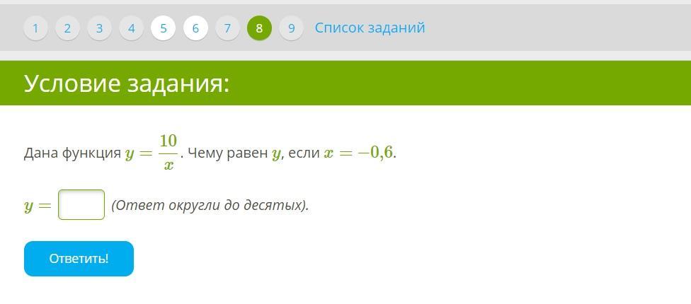 y =  \frac{10}{  - {0,6} } \\y=\frac{100}{-6} \\y=-\frac{50}{3} =-16,7