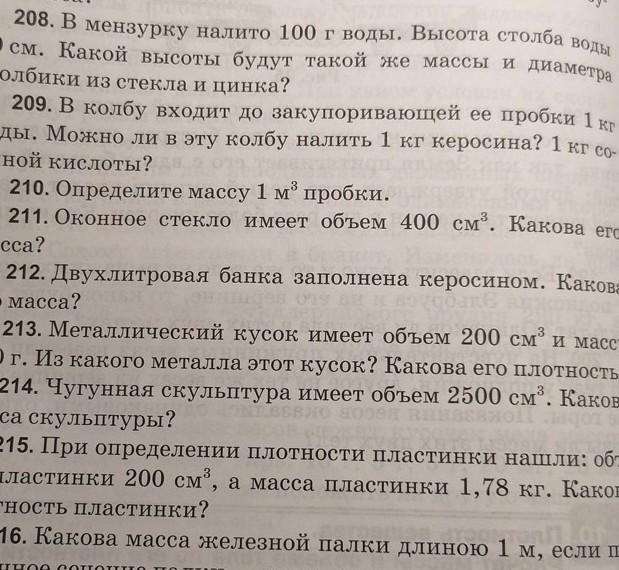 209 - Чтобы решить данную задачу, надо узнать плотность веществ. Итак, плотность воды - 1000кг/м^3, керосина - 800кг/м^3 .Мы знаем что формула плотности такова: р=м/V, выразим отсюда массу и получим: m=p*V. Из этого следует, что чем больше плотность, тем больше масса.