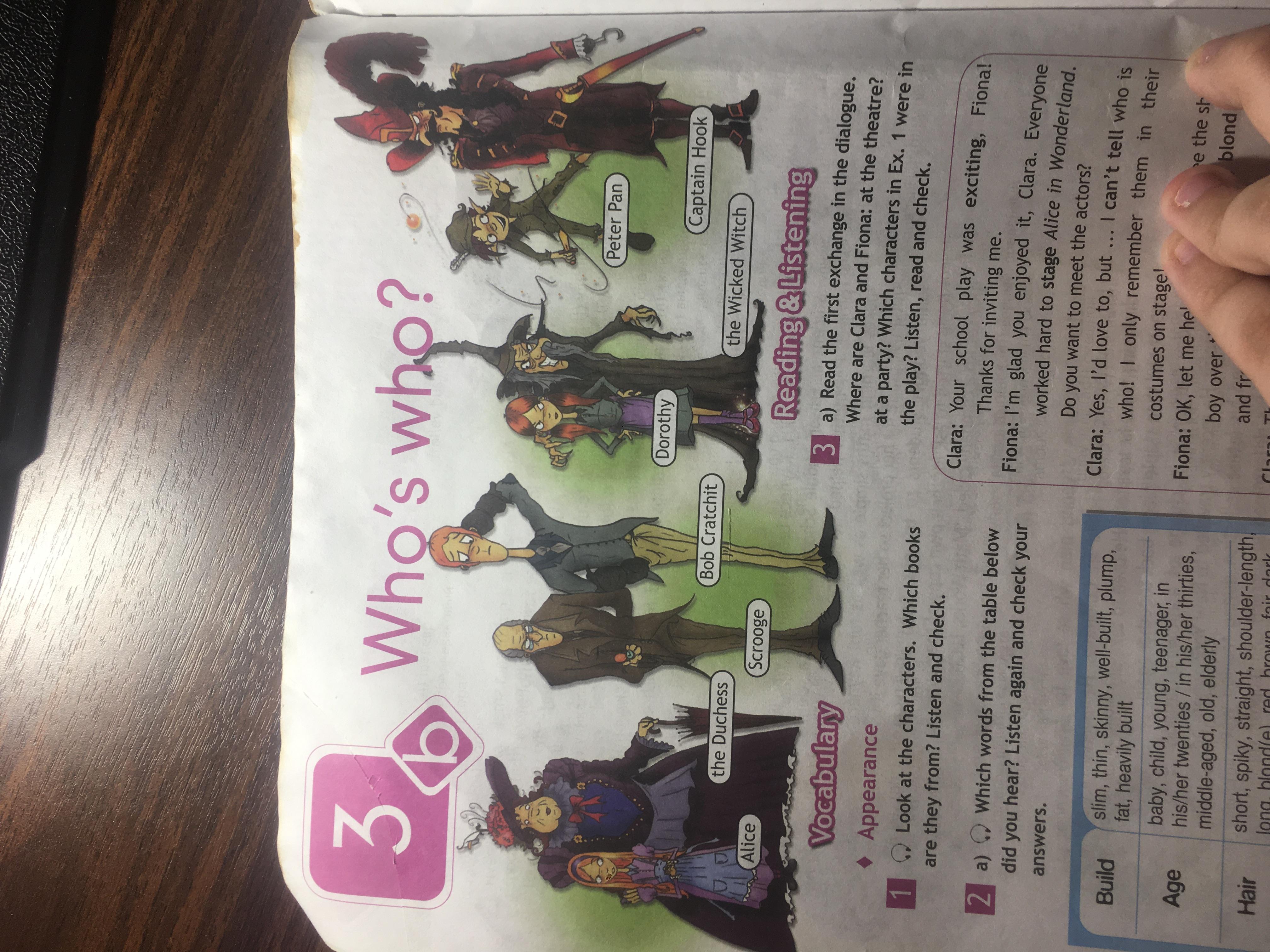 1. Alice is a child. She is a thin girl with long red (рыжие) straight hair. She isn't tall, but she has a cute thin face. I think, she also has freckles.