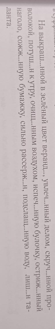 На выкрашенной в зеленый цвет веранде, увлечённый делом, скрученный проволокой, потушен к утру, очищенным воздухом, испечённую булочку, подслащённую воду, лишён таланта.