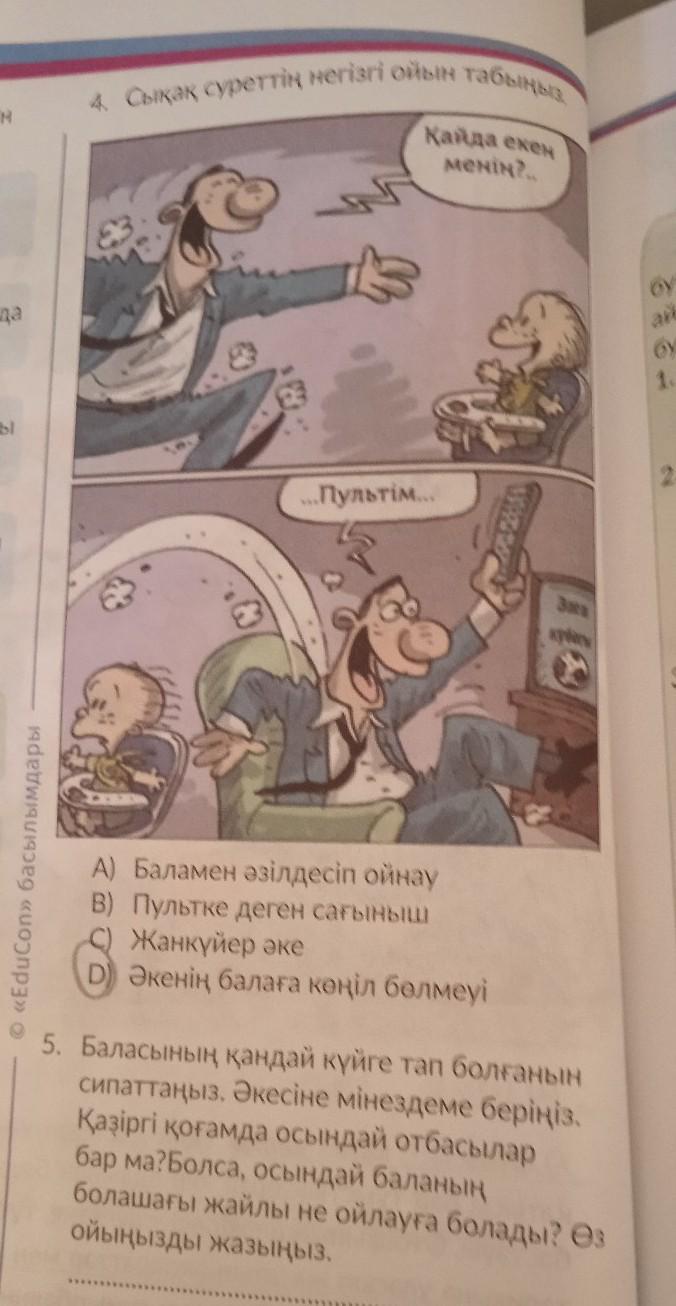 Біз 4 тапсырмадагы суретер арқылы отбасылық жағдай туралы көп жағдай біле аламыз.Кішкентай бала есі енді кіріп келе жатқан әкесінің оған емес пультке жүгіргеніне қарап өзінің бағалы емес немесе пульттей қадірі жоқ деп санайды.Әкесі істерін аяқтап келіп демалмақшы болып үйге келген сияқты бірақ бірунші пультке жузирди, оз балаларымыздың ұрпақтарымыздың тәрбиесіне караумыз керек.Отан отбасыдан басталады, әр адамның ,сәбидің өміріңдегі еңбастысы отбасы отбасыдан біз өмірді түсінеміз