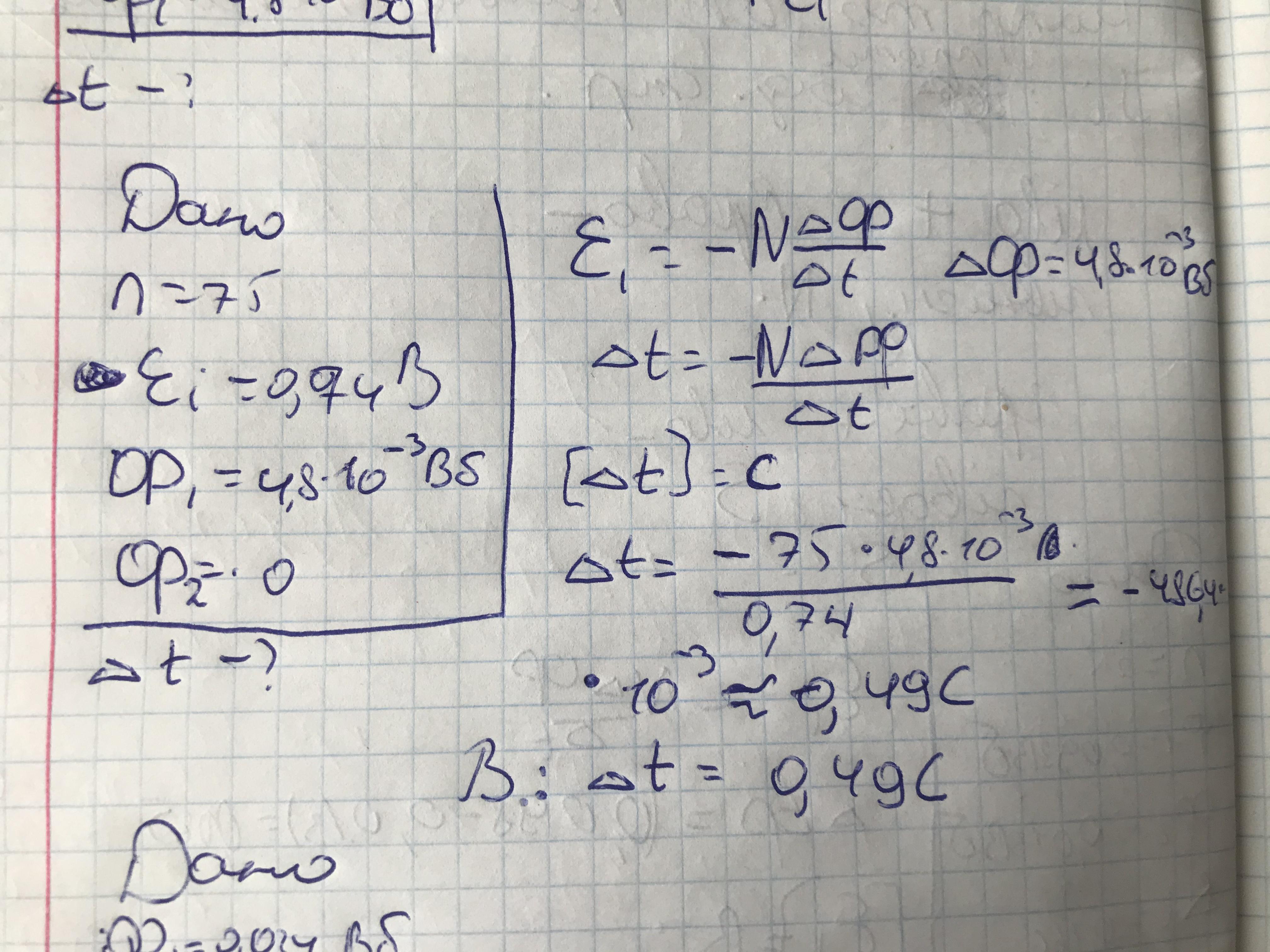 У котушці із 75 витків магнітний потік дорівнює 4,8 ⋅ 10^–3 Вб. За який час повинен зникнути цей потік, щоб в котушці виникла середня ЕРС індукції, яка дорівнює 0,74 В?