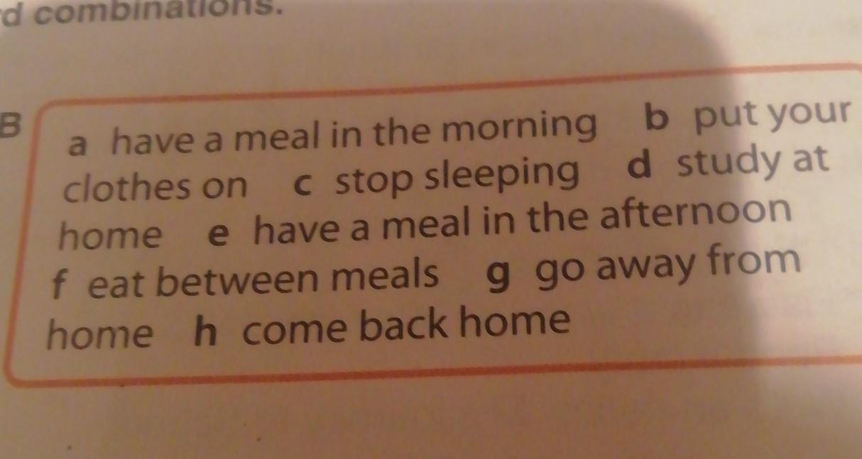 a) по утрам ты можешь перекусить. b) положи свою одежду. c) перестань спать. d) учиться дома. e) перекуси после обеда. f) ешь между приемами пищи. g) уходи из дома. h) вернись домой
