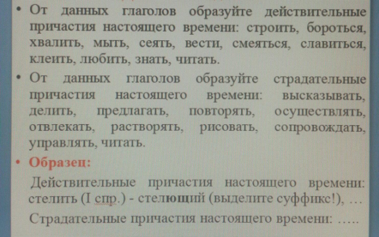 1. строить - строящий, бороться - борющийся, хвалить - хвалящий, мыть - моющий, сеять - сеющий, вести - ведущий, смеяться - смеющийся, славиться - славящийся,клеить - клеящийся, любить - любящий, знать - знающий, читать - читающий.