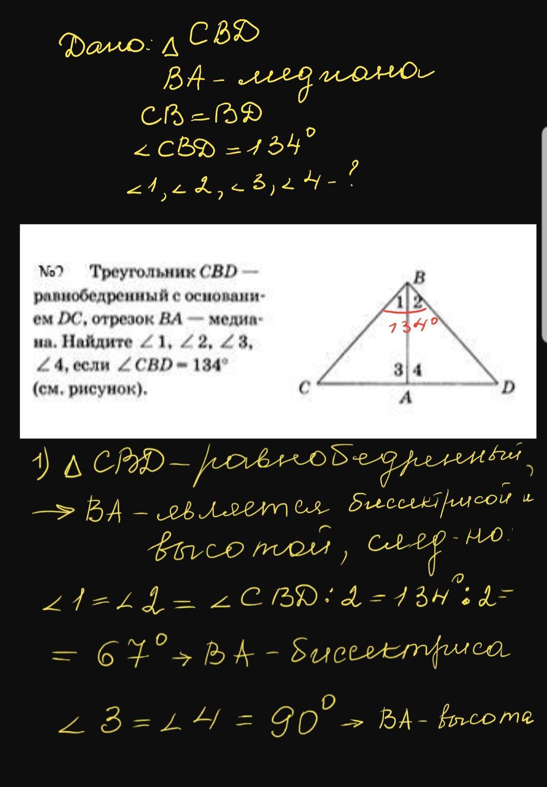 1. Треугольник BCD - равнобедренный, исходя из свойств равнобедренного треугольника следует, что медиана BA также является высотой и биссектрисой треугольника BCD, то есть угол BAC = углу BAD = 90°;
