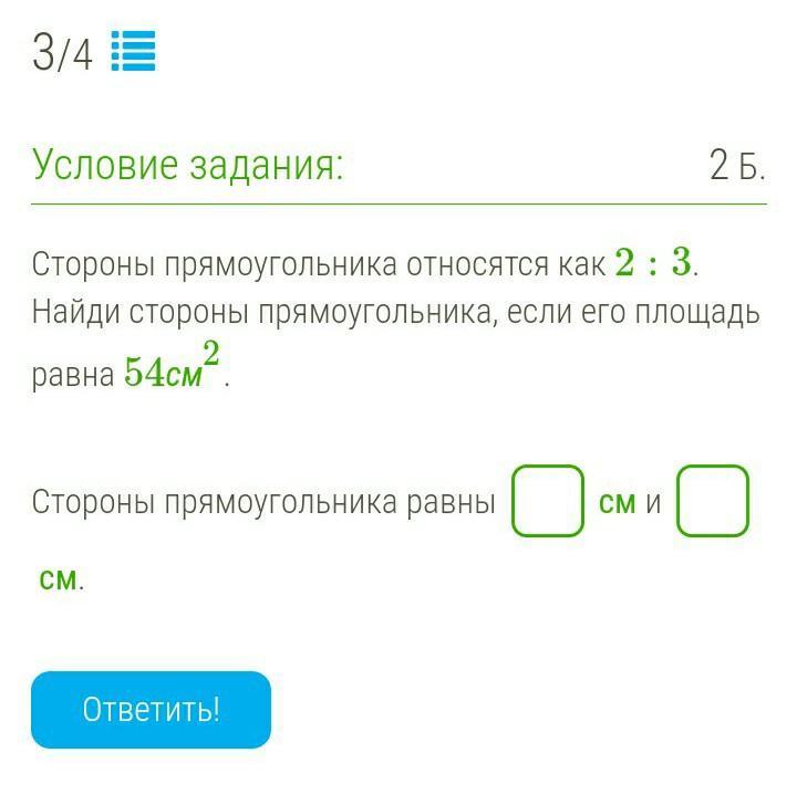 Найди стороны прямоугольника, если его площадь равна 54см2.