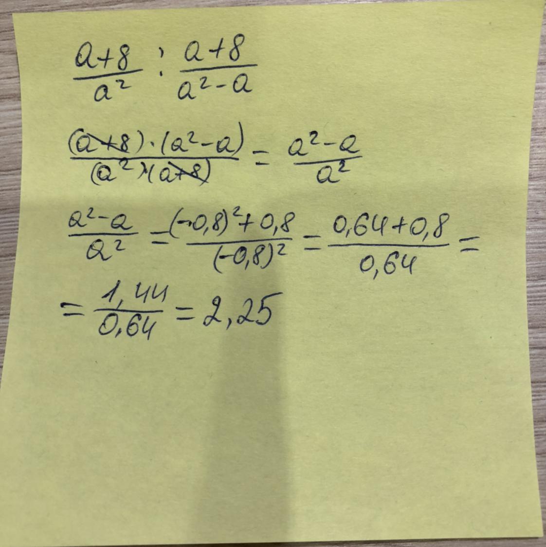 = (a+8)*a*(a-1) /a^2 *(a+8) =(a-1)/a =(-0,8-1)/ (-0,8) =-1,8/ -0,8=18/8=9/4=2,25