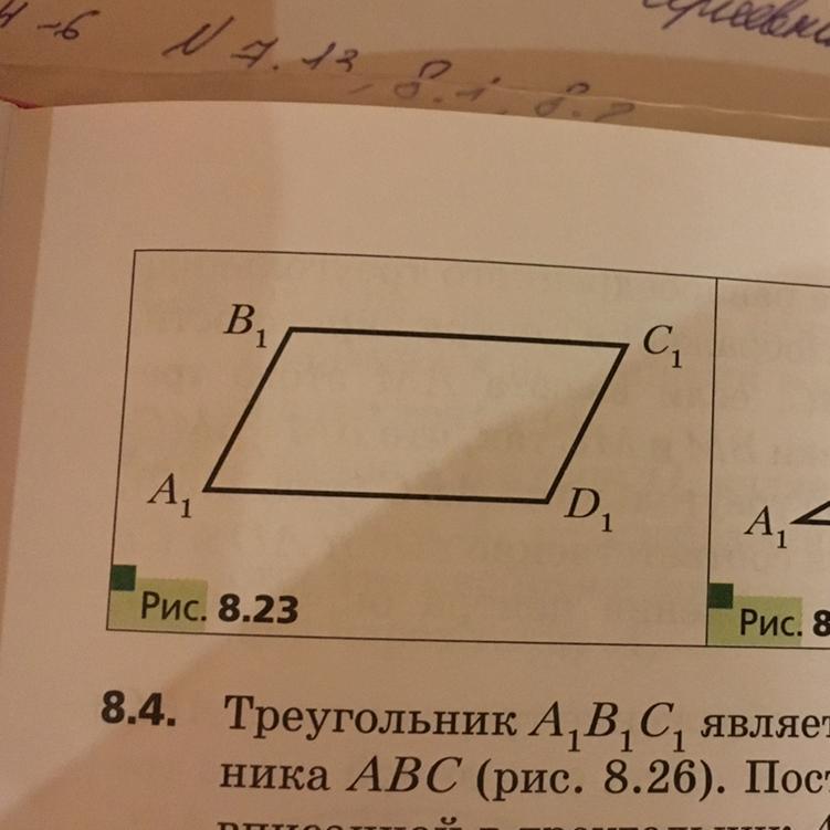 Параллелограмм A1B1C1D1 является изображением прямоугольника ABCD(рис. 8.23). Постройте изображение перпендикуляра, опущенного из точки пересечения диагоналей прямоугольника на сторону BC