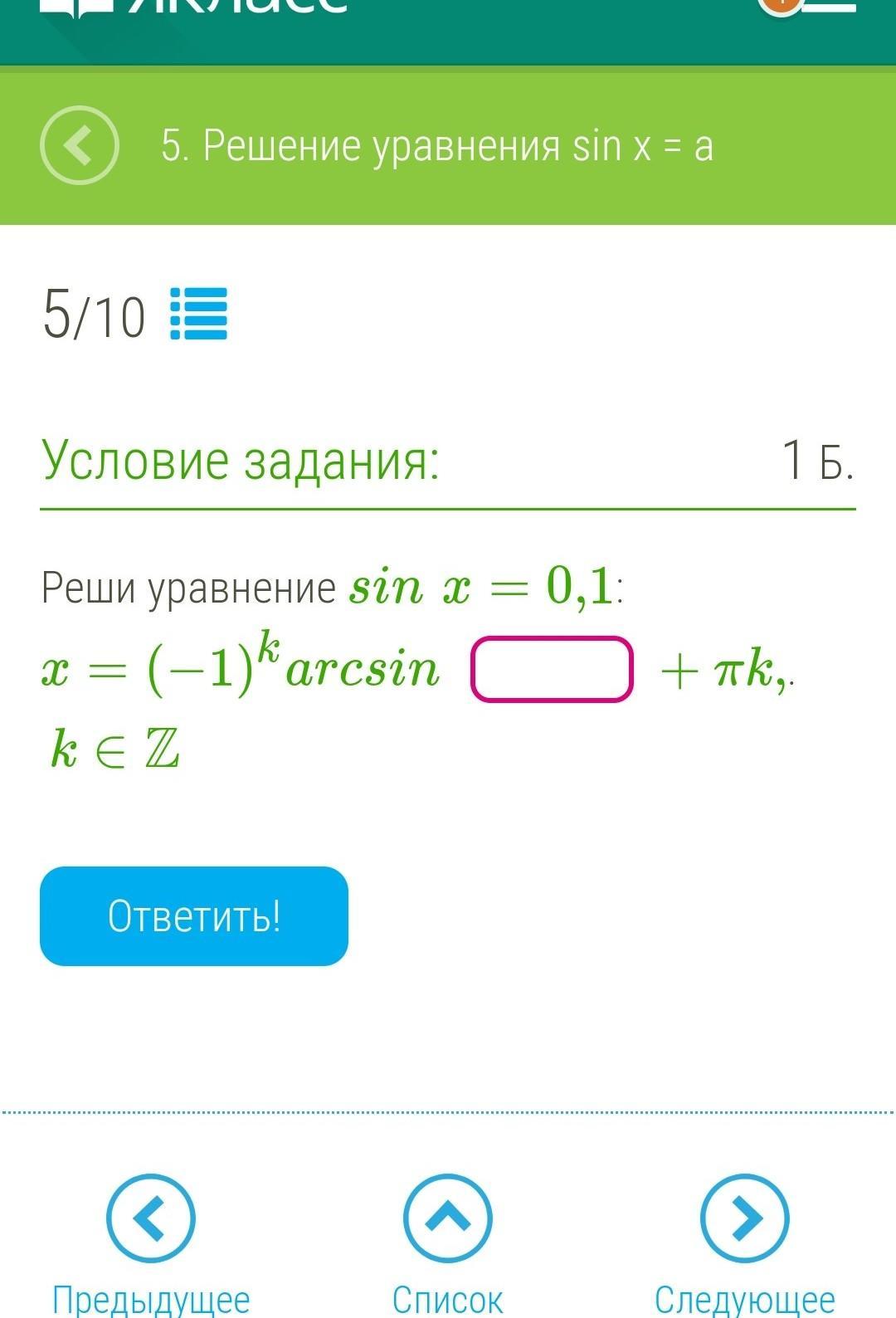 Найдем обратный синус от обеих частей уравнения, чтобы извлечь
