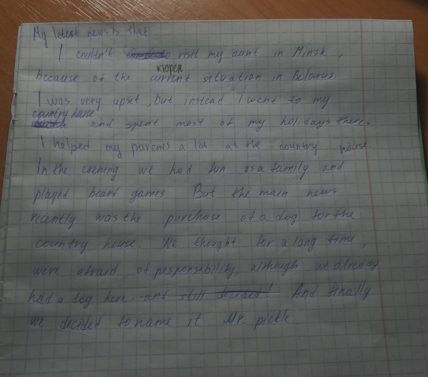 Ты пишешь, "I was very upset, but instead...", это довольно странно звучит, лучше заменить "instead", переводящийся как "вместо этого" на "but for that", что буквально означает "зато" . Просто звучит лучше. Далее, в предложении "I helped my parents a lot at the country house" лучше заменить "at the country house" на "there" (там), чтоб тавтологии не было, но если перестанет хватать слов, тогда не стоит. В следующем предложении ты пишешь "In the evening", т.е. имеешь ввиду конкретный вечер. Если нужно было сказать "по вечерам", то так и пиши: "in the evenings". Также, "had fun as a family" стоит сменить на "had family fun", краткость - сестра таланта, особенно в английском. "main news" лучше заменить на "big news", хотя особой разницы нет. "We thought for a long time" - после "thought" вставь "about it", вы ведь думали об этом, а не просто о чём-то. "were afraid of responsibility" - зря "we" в начале не поставила, в русском это норм тема, а в англе так лучше не делать. "We already have had a dog there". "But finally" лучше, чем "And finally" в данном контексте. И ещё тут по содержанию странно вышло: сказано, как вы его назвали, но не сказано, что вы его всё-таки купили. Это нужно в тексте уточнить.