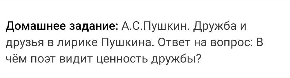 Для Пушкина чувство дружбы — это огромная ценность, которой равновелики лишь любовь, творчество и внутренняя свобода. Тема дружбы проходит через все творчество поэта, от лицейского периода и до конца жизни. В сердечности и искренности друзей Пушкин видит самое ценное: “Он друг без этикета, Не требует привета Лукавой суеты”.