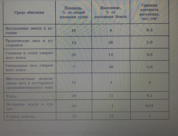 Меньше всего людей живет за полярным кругом, а больше всего в смешанных лесах умеренного пояса. Леса умеренного пояса занимают самый маленький процент площади суши, а саванны и степи умеренного - самый большой