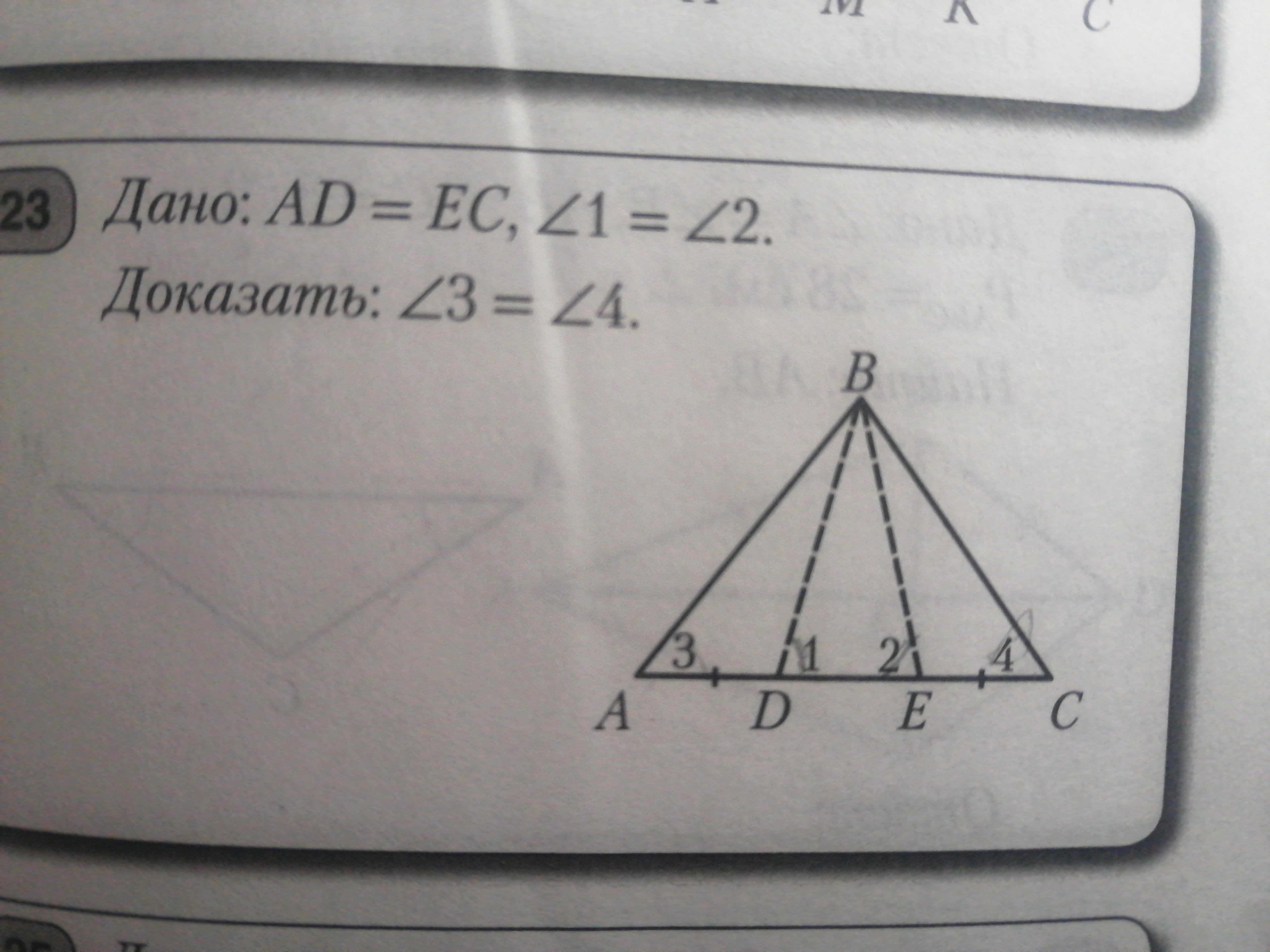 Угол BDA= углу ВЕС, АD=EC, BD=BE следовательно треугольники BAD и BEC равны по двум сторонам и углу между ними следовательно угол 3= углу 4 как соответственные элементы равных треугольников