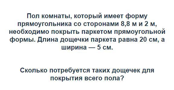 Пол комнаты, который имеет форму прямоугольника со сторонами 8,8 м и 2 м, необходимо покрыть паркетом прямоугольной формы. Длина дощечки паркета равна 20 см, а ширина — 5 см.