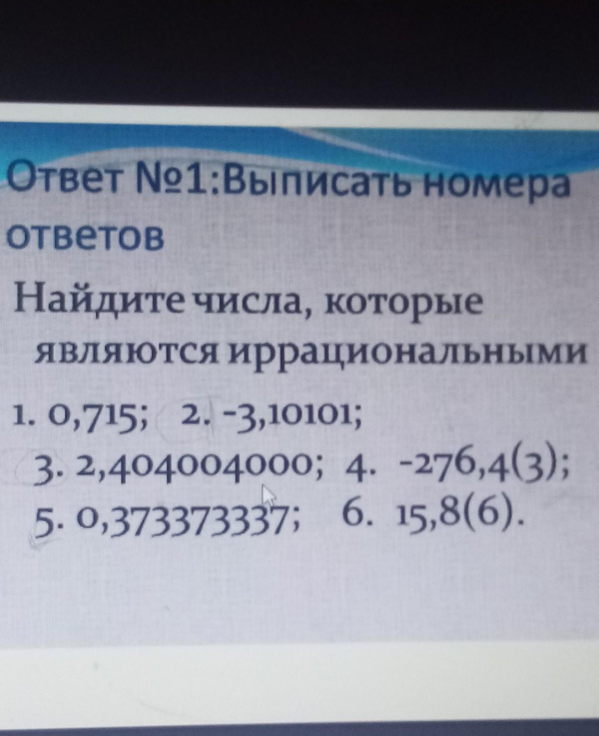 иррациональным числом называется число,которое нельзя представить в виде обычной дроби. Периодическая десятичная является рациональным,а бесконечная десятичная без видимого повтора всех элементов является иррациональной. Корень из 2 - иррационален,корень из 3 или 5 тоже иррационален 0,(3) рационален это 1/3. В примерах 1,2,4 и 6 рациональные. А 3 и 5 - рациональны,если десятичная дробь не продолжается,то есть конечна. Иррациональны (при условии многоточия в конце) потому,что в десятичной дроби нет периодичности...