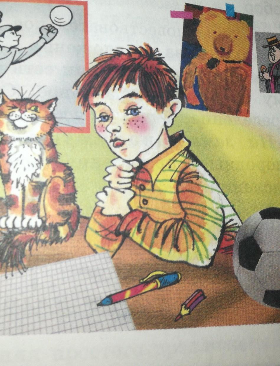 На рисунке видно, что мальчик хотел сел писать письмо любимому дедушке. Он очень скучает и поэтому положил перед собой фотографию деда. К нему присоединился кот. В письме мальчик рассказывает о своих достижениях в футболе. Ещё он рассказывал о своей последней игре, там он был вратарём и отбив последний мяч, его команда выиграла. Отбивая мяч его успели сфотографировать, но кроме фотографии с этой игры ему ещё достался тот самый мяч!