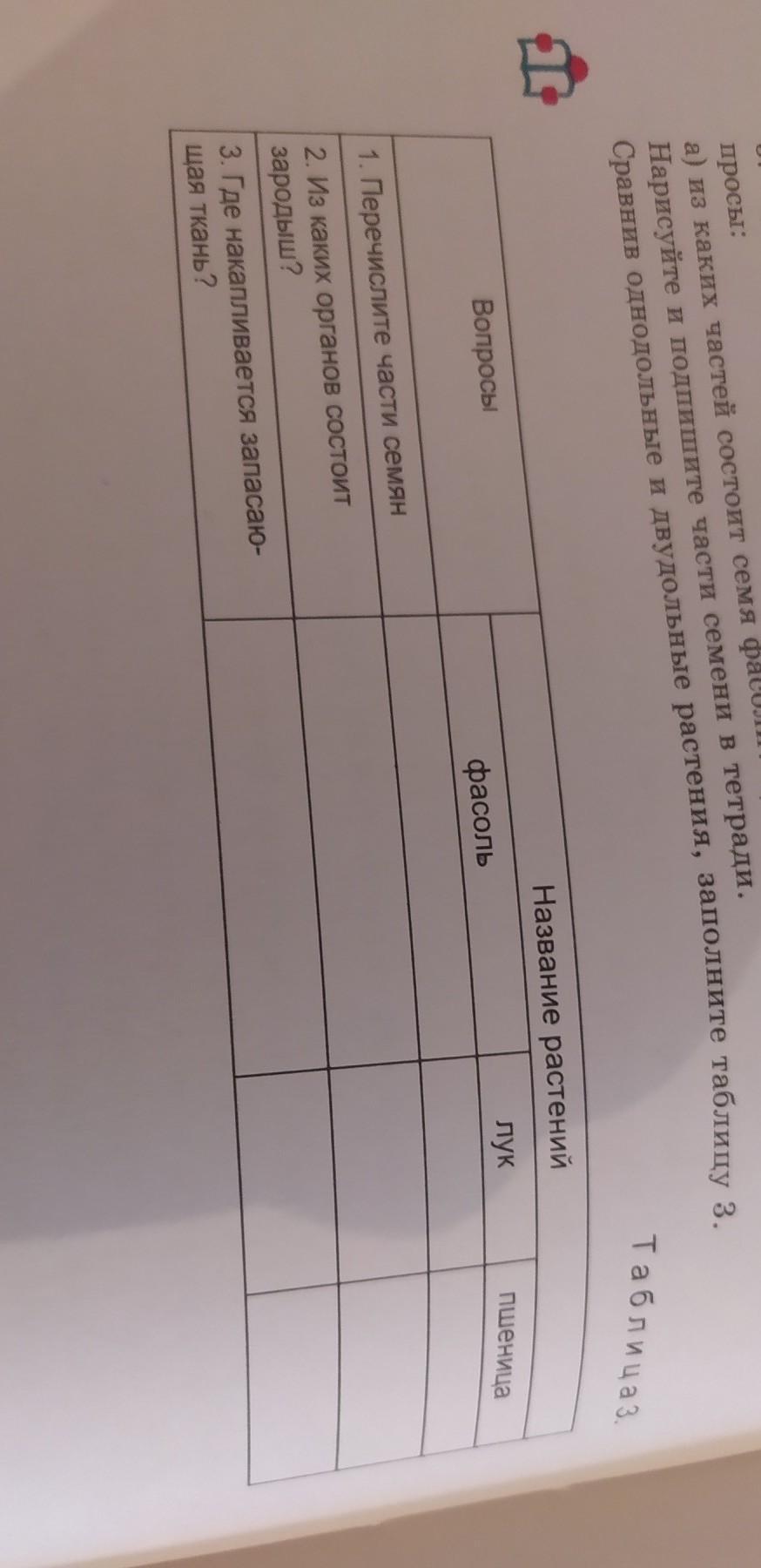 заполните таблицу вопросы перечислите части семян 2 из каких органов состоит зародыш 3 где накапливается запасающая ткань
