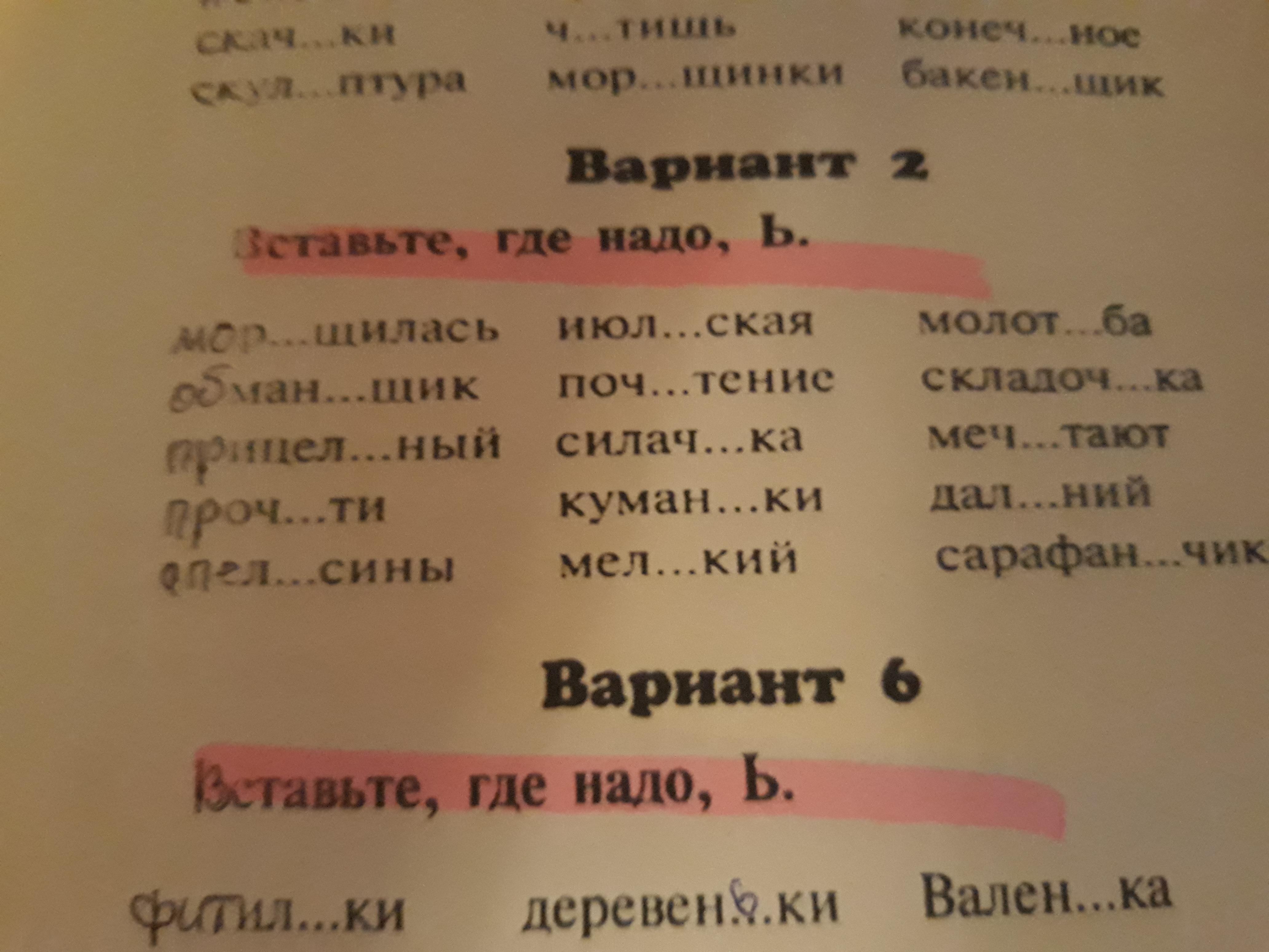 обманщик, морщилась,прицельный, прочти, апельсины, июльская, почтение, силачка, мелкий, молотьба, складочка, мечтаю, дальний, сарафанчик, (вариант 6-первый столбик первое слово)-петельки, деревеньки, Валенька.