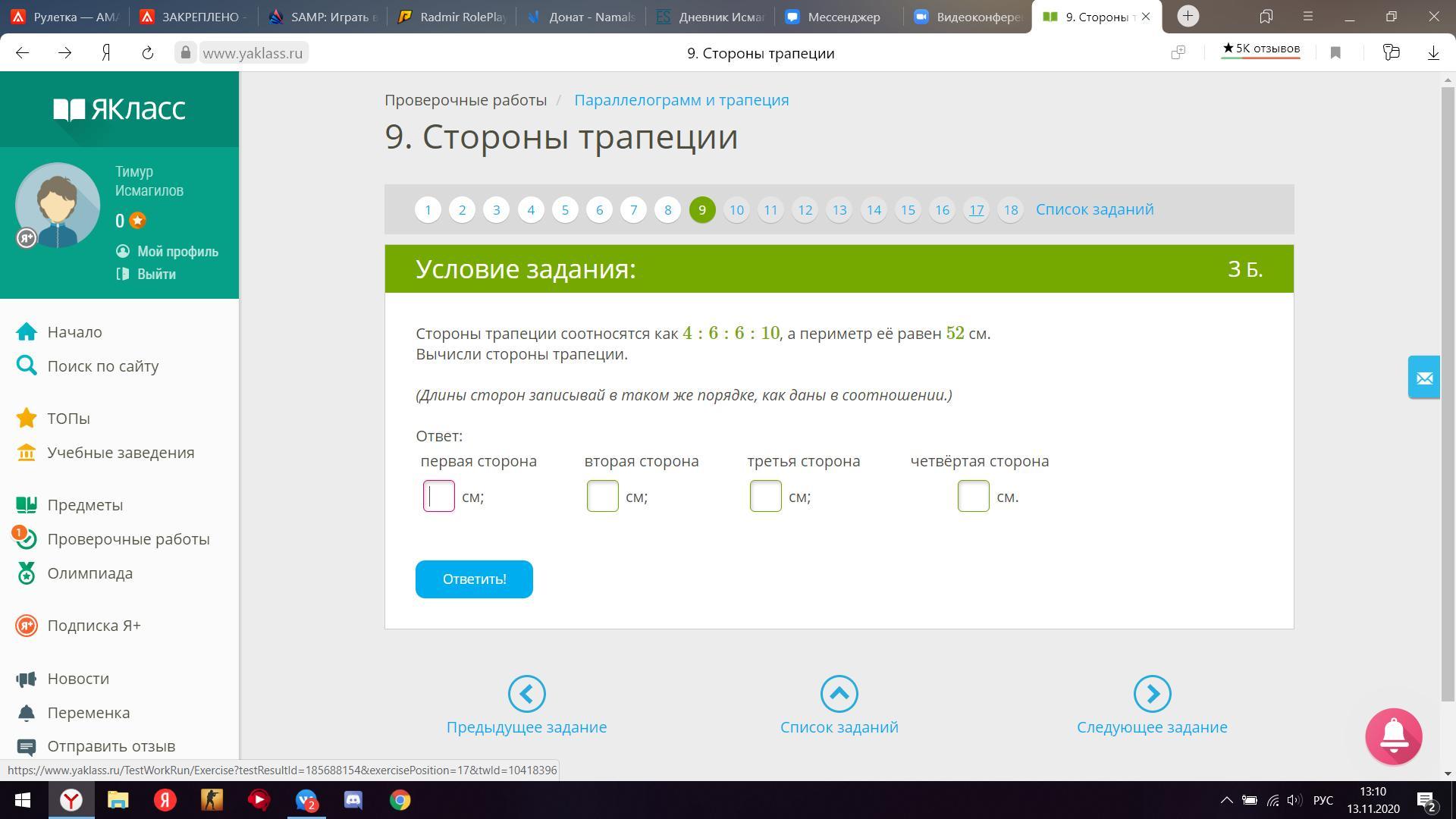 Стороны трапеции соотносятся как 4:6:6:10, а периметр её равен 52 см.