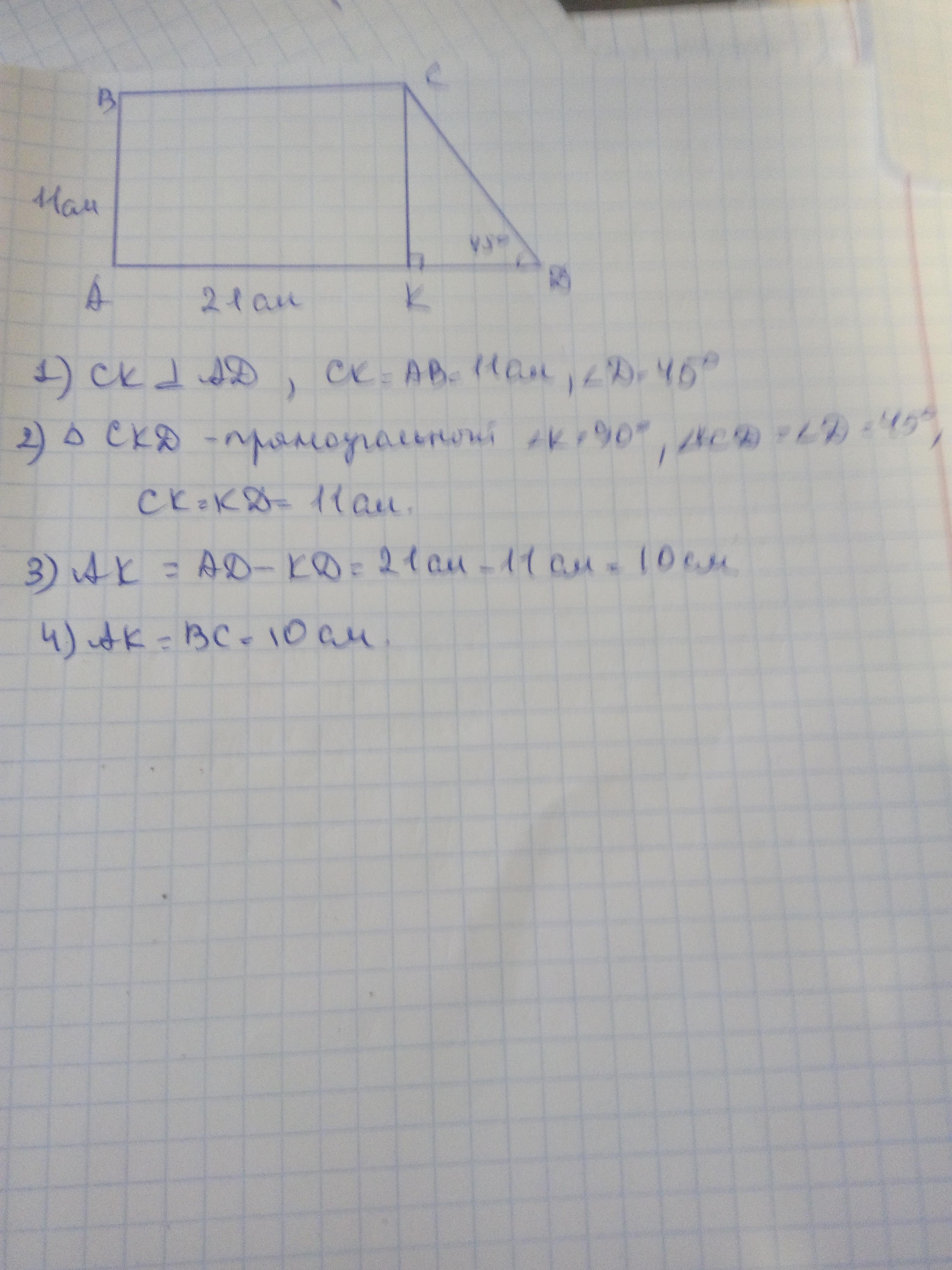 Меньшая боковая сторона равна 11 см, а большее основание равно 21 см.