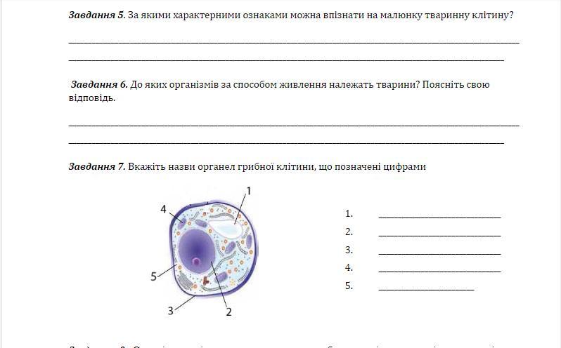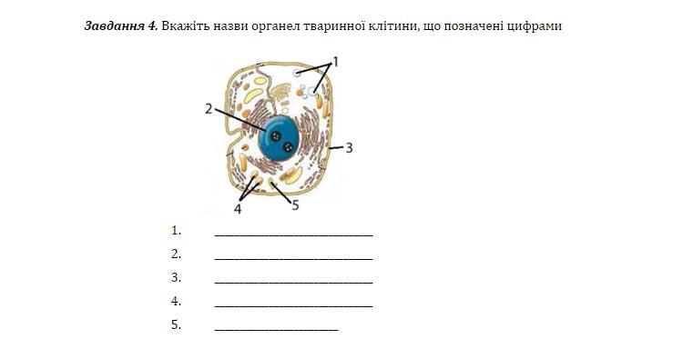 1. Вакуоль 2. Ядро 3. Мембана 4. мітохондрії 5. Включення