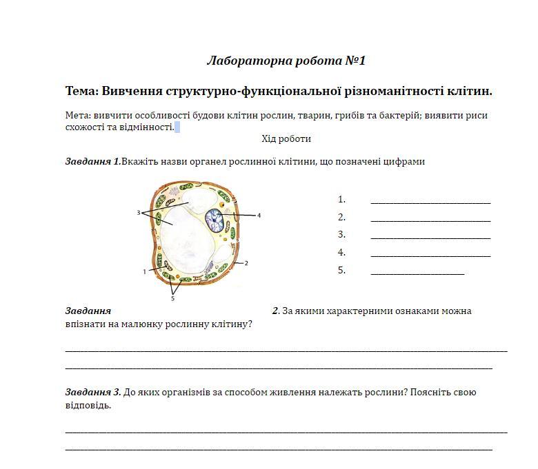 1. Мітохондрії , 2 Клітина стінка, 3. Вакуоль, 4. Ядро, 5. Хлоропласти.