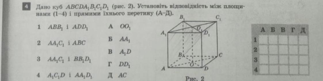 Дано куб АВCDA, B, C, D, (рис. 2). Установите соответствие между площинами (1-4) и прямыми ихнього сечения (А-Д).
