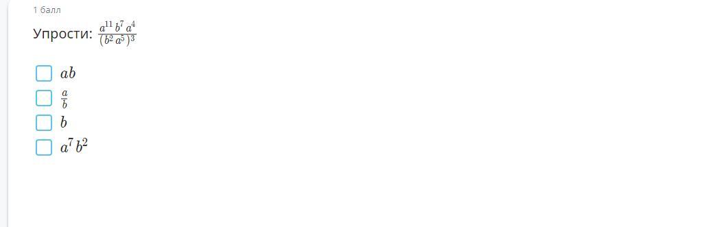 a¹¹b⁷a⁴ / (b²a⁵)³ = a¹⁵b⁷ / a¹⁵b⁶ = b