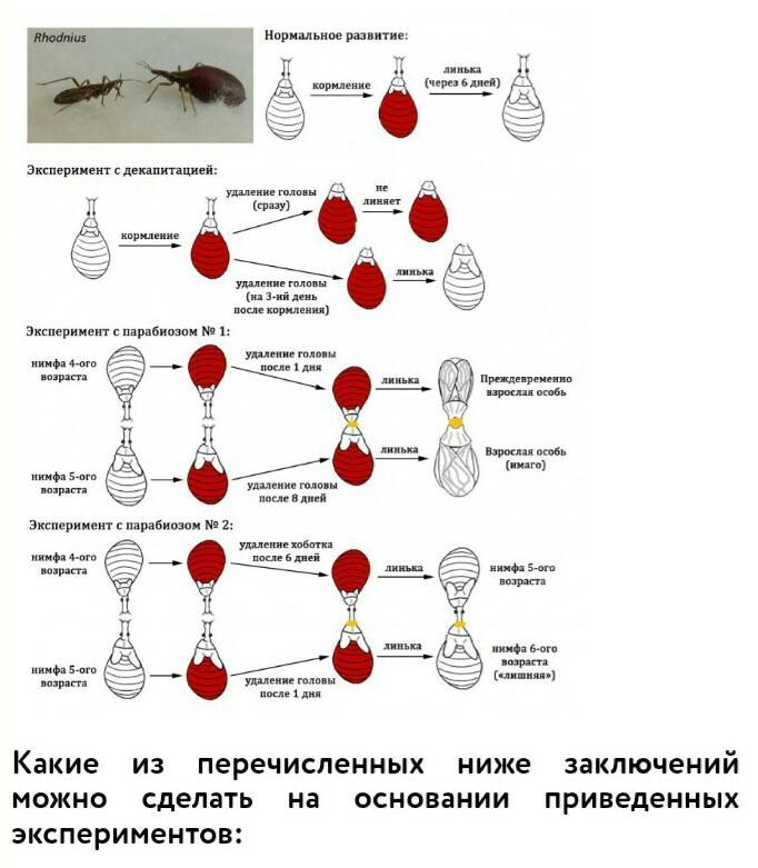 2)Удаление головы на третий день после кормления кровью стимулирует запуск процессов линьки, однако если удалить голову сразу, то особь не успевает понять, что она покушала и запуска линьки не происходит.
