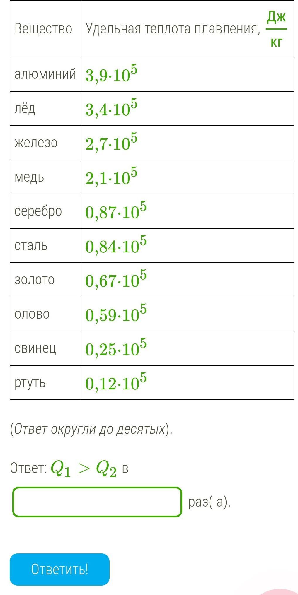Сравни Q1 и Q2 — количество теплоты, необходимое для плавления цилиндров из алюминия и железа массой по 12 кг каждый, если они нагреты до температуры плавления. Удельная теплота плавления указана в таблице.