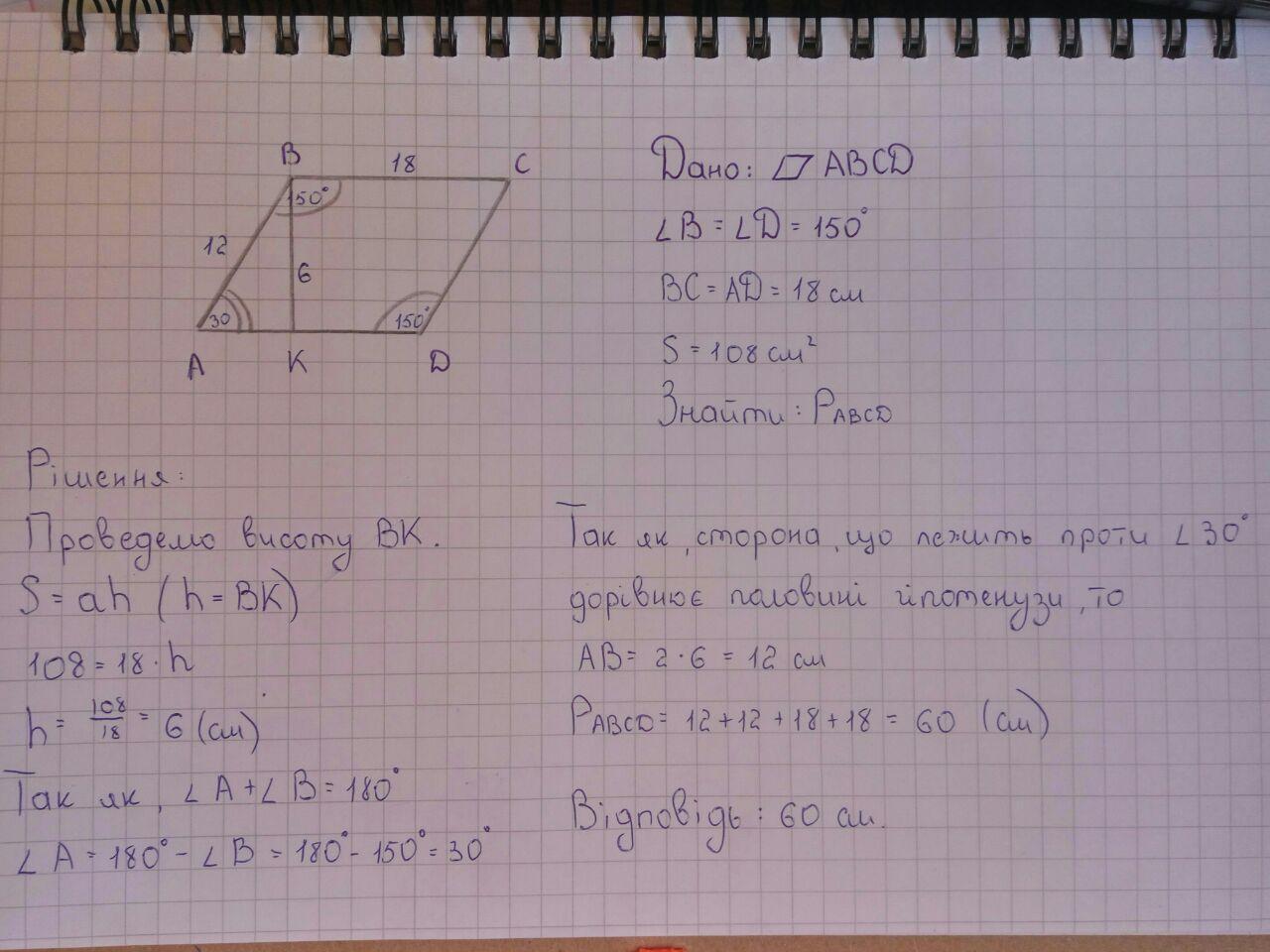 В параллелограмме угол равен 150°, большая сторона равна 18 см, площадь параллелограмма 108 см2. Найдите периметр параллелограмма. Ответ дайте в сантиметрах.