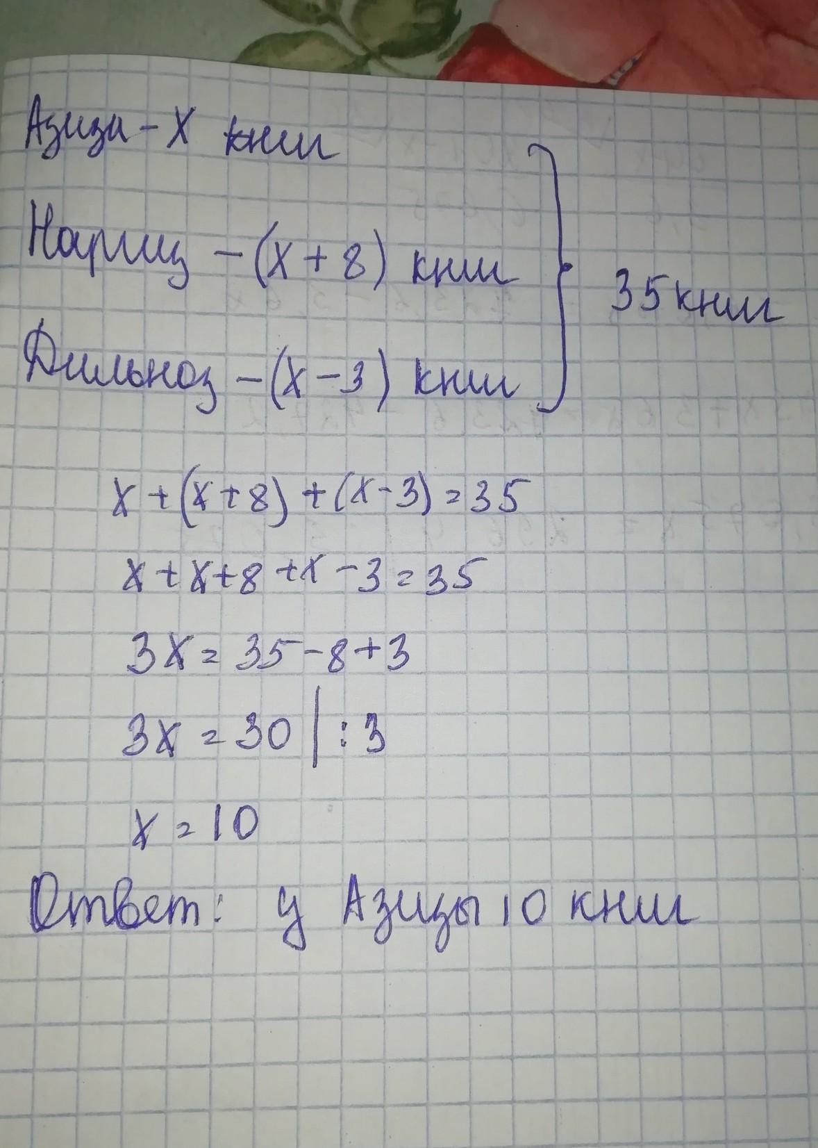 У Азизы х книг, у Наргизы больше на 8 , а у Дилнозы меньше, чем у Азизы на 3 книги. Всего у сестер 35 книг. Сколько книг у Азизы