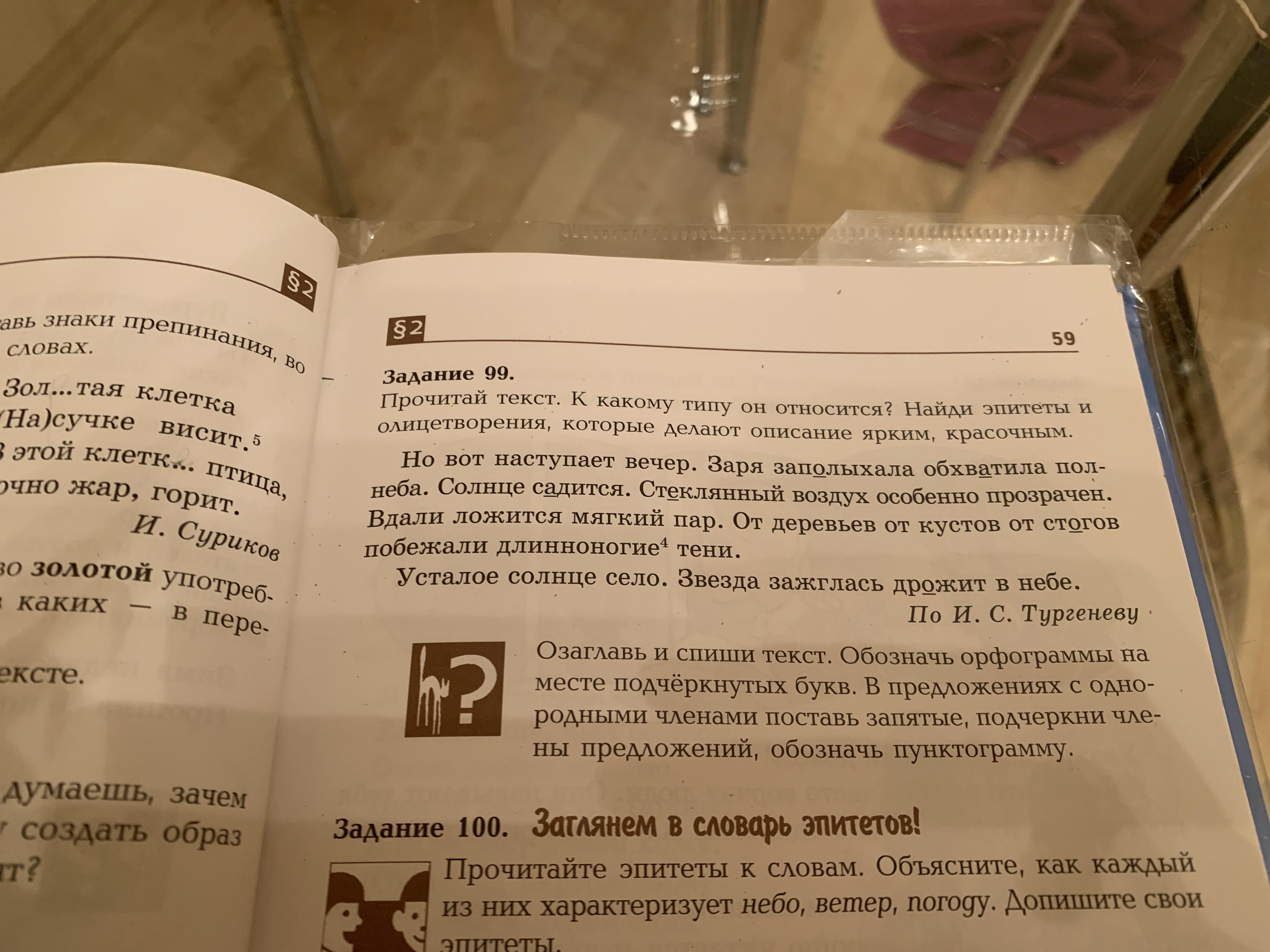 Это текст повествование. Нам просто рассказывают. Олицетворения-это когда мы делаем предмет "человеком" Олицетворения- солнце садится, ложится пар, побежали тени, солнце село, звезда дрожит. Эпитеты-это такие красивые выражения. Эпитеты- заря заполыхала, стеклянный воздух, мягкий пар, у ставшее солнце. Удачи!