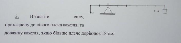 Визначте силу, прикладену до лівого плеча важеля, та довжину важеля, якщо більше плече дорівнює 18 см