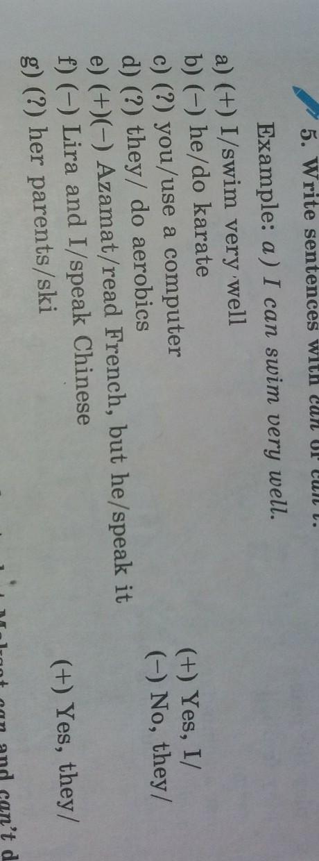 Ответ: he can’t do karate. Can you use a computer? Can they do aerobics? Azamat can read french, he can’t speak it. Lira and i Cant speak Chinese. Can her parents ski?