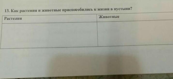 Объяснение: Животные в пустыне обычно серовато-желтой или бурой окраски, что помогает им сливаться с цветом песка. Они могут долгое время обходится без воды или же просто не пить ее. Им хватает влаги, которую они получают, поедая растения. Также некоторые ведут ночной образ жизни или впадают в спячку, а дневные животные в основном находятся под тенью деревьев. Маленькие обитатели пустынь от жары прячутся в песке, зарываясь в него. Растения способны запасать влагу в стеблях, а их листья преобразованы в колючки, способные выдержать пустынную жару. Некоторые, с наступлением жары, сбрасывают листья и молодые побеги. Другие растения "живут" только в прохладный период. Также есть растения-насосы с корнем по 2-3 метра. На такой глубине они находят воду. В основном в пустыне растут низкорослые, с утолщенными листьями и/или стеблями растения.
