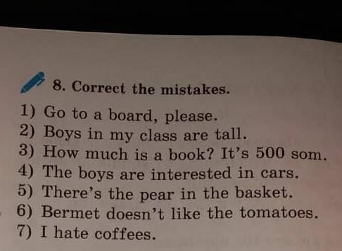 1.Go to the board, please. 2.The boys in my class are tall. 3. How much is the book? It's 500 som. 4.Boys are interested in cars. 5.There's a pear in the basket. 6.Bermet doesn't like tomatoes. 7.I hate coffee.