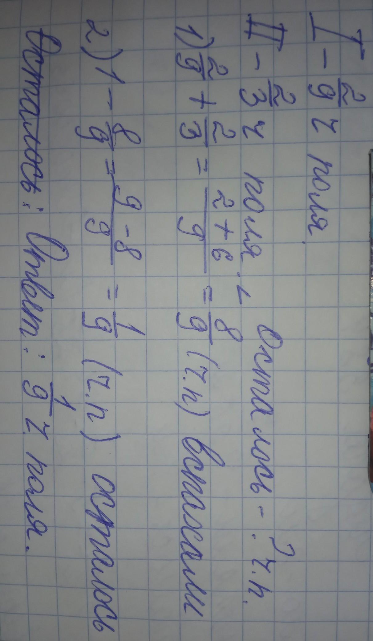 Пусть всё поле- х, тогда первый тракторист вскопал площадь, размером (2/9)х, а второй- (2/3)х. Тогда нам надо найти x-I-II.