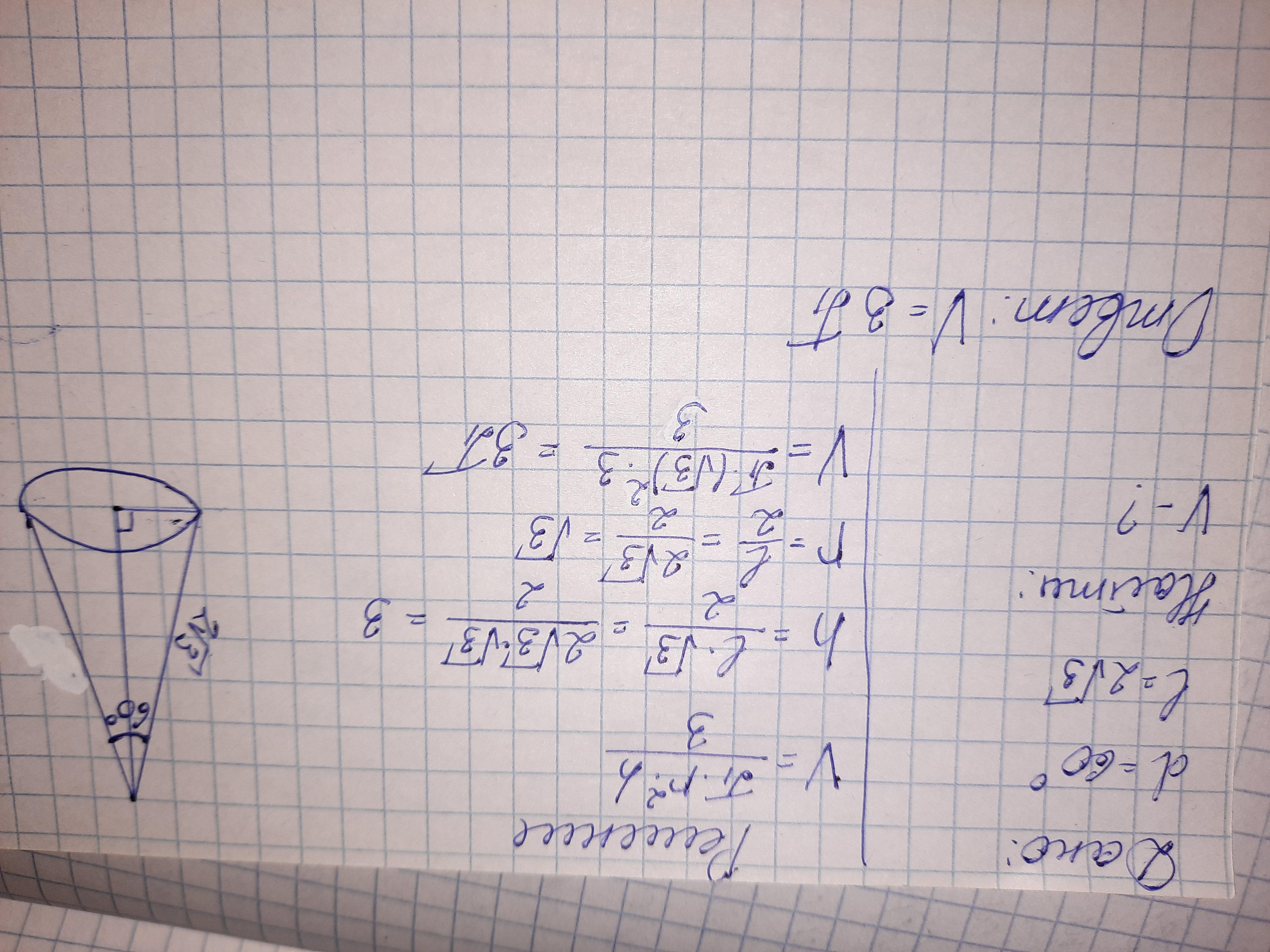 Угол при вершине осевого сечения конуса равен 60°, образующая равна 2√3. Найти объем конуса, полагая π=3,14.
