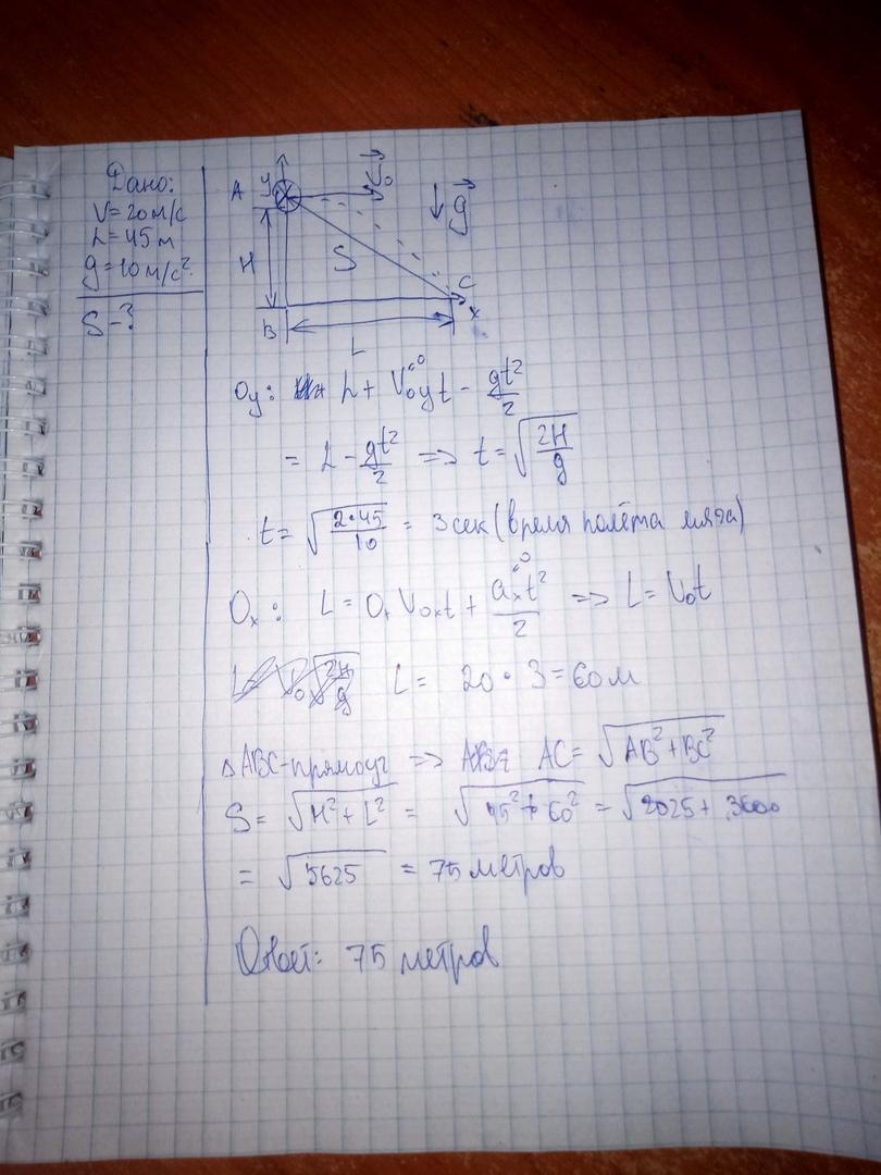 Мяч, брошенный со скоростью 20м/с из окна, находящегося на высоте 45м, упал на некотором расстоянии от окон дома. Каков модуль перемещения мяча? Сопротивлением воздуха пренебречь. Ускорение свободного падения можно принять равным 10м/с². Ответ выразите в метрах.