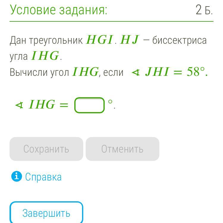 JH-биссектрисса. Делит угол I HG пополам. А уголJHI=58.значит угол IHG=58×2=116