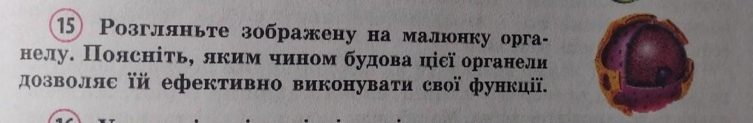 15) Розгляньте зображену на малюнку органелу. Поясніть, яким чином будова цієї органели
