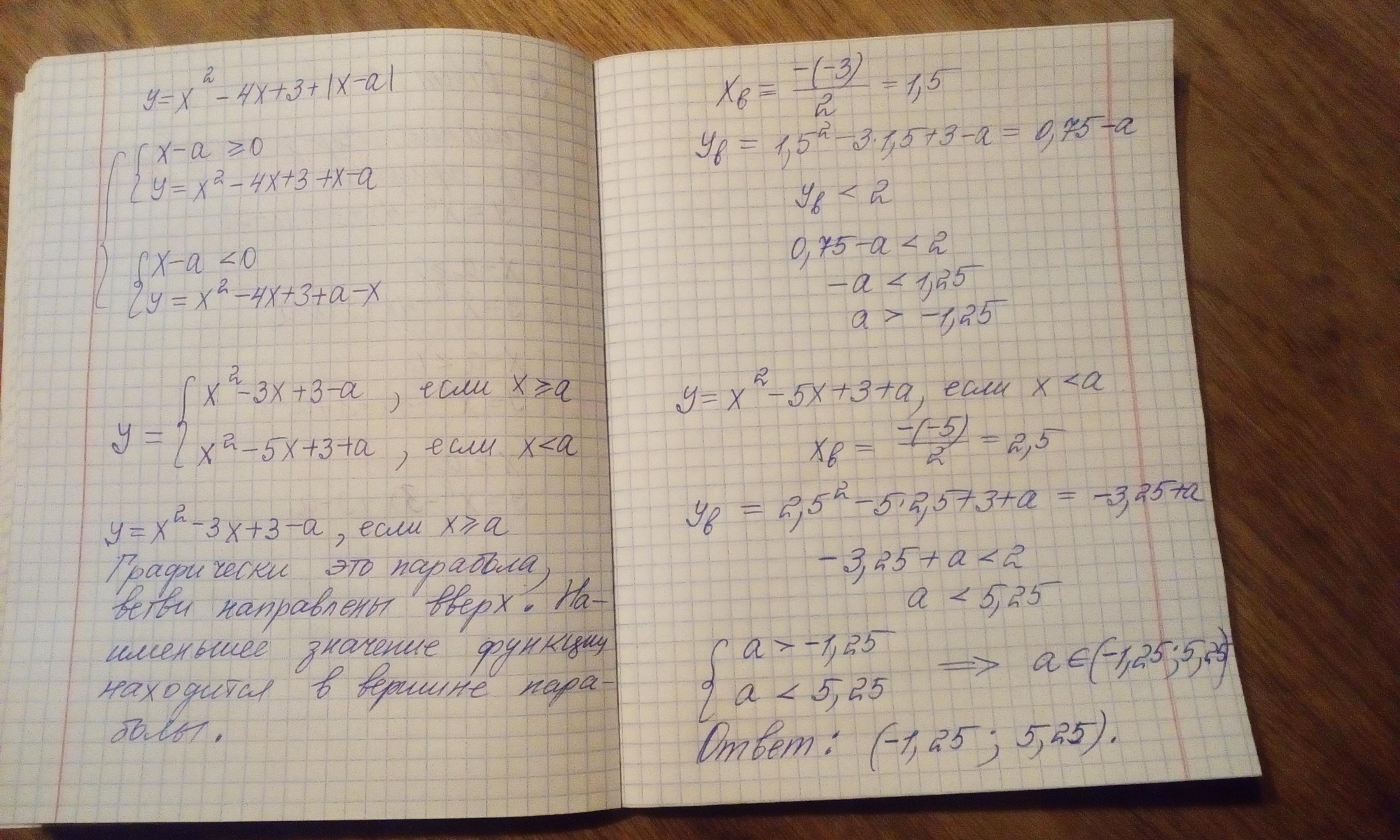 При каких значениях параметра а наименьшее значение функции y=x^2-4x+3+|x-a| меньше , чем 2?Решите с графиком параболы и функции |x-a| и с объяснением.