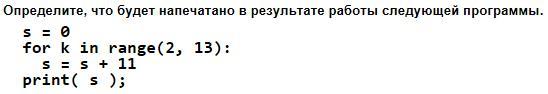 for k in range(2, 13): // Цикл выполняется 11 раз (2, 3, 4, 5, 6, 7, 8, 9, 10, 11, 12)