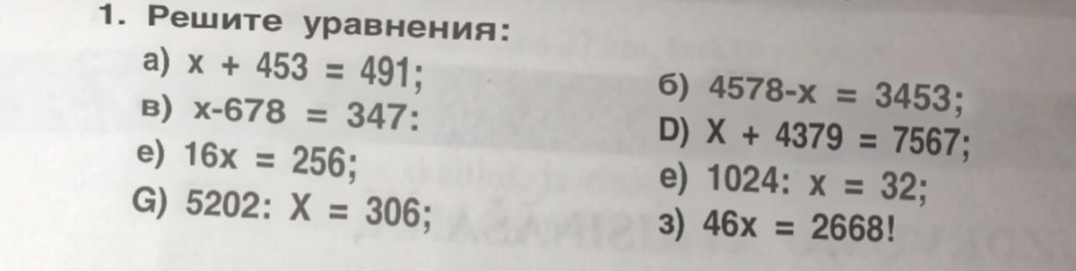 Реши уравнения: а) 453 = 491; c) х - 678 = 347; e) 16x = 256; г) 5202 x = 306; б) 4578 - x = 3453; d) x 4379 = 7567; е) 1024 : x = 32; h) 46x = 2668!