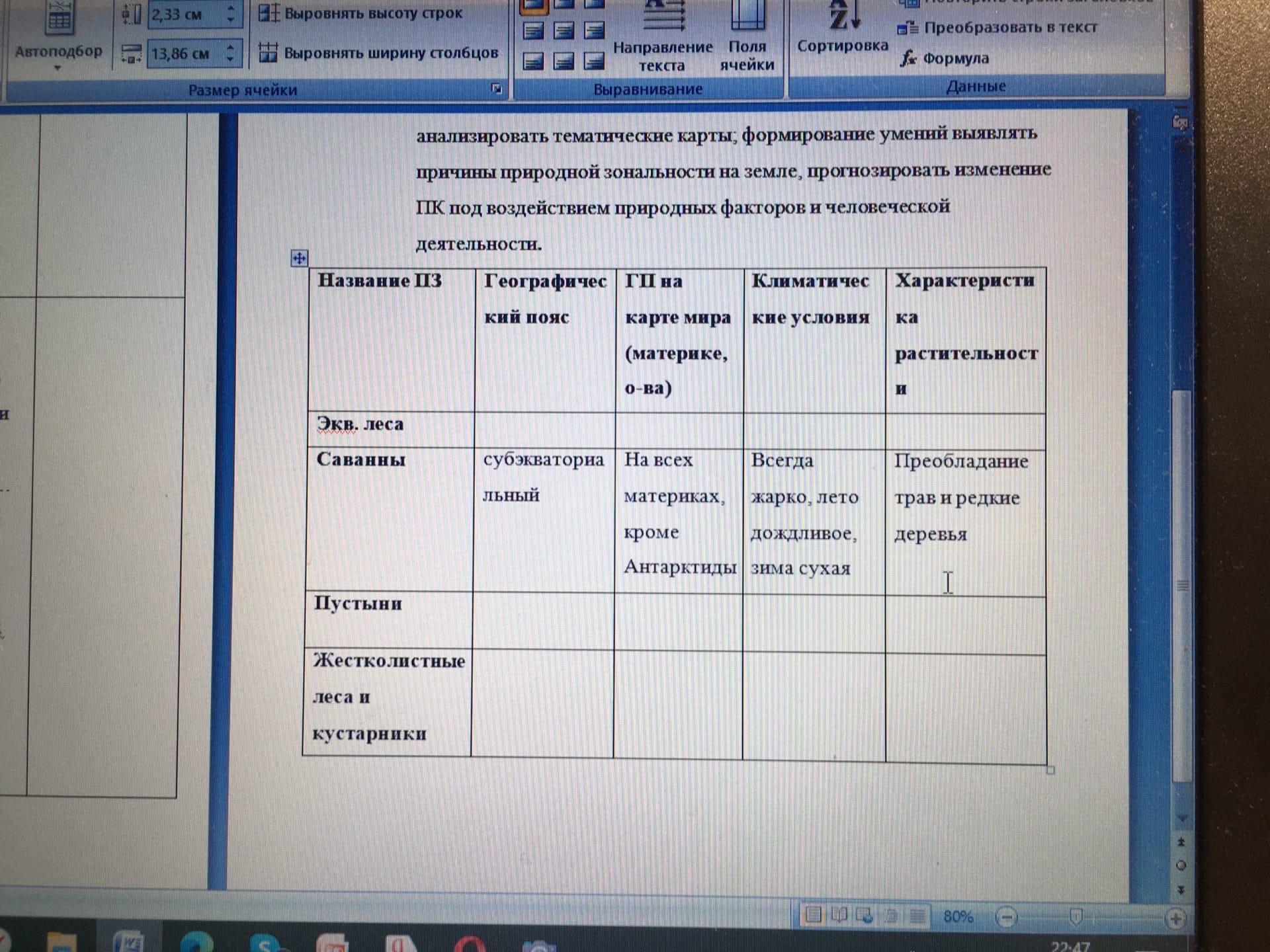 Пустыни: характеристика растительности: колючки, кустарники, (изредка можно увидеть алоэ, акации)