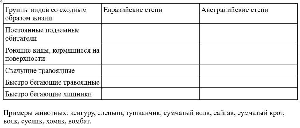 Выберите виды, занимающие сходные экологические ниши в евразийских и австралийских степях. Заполните таблицу.